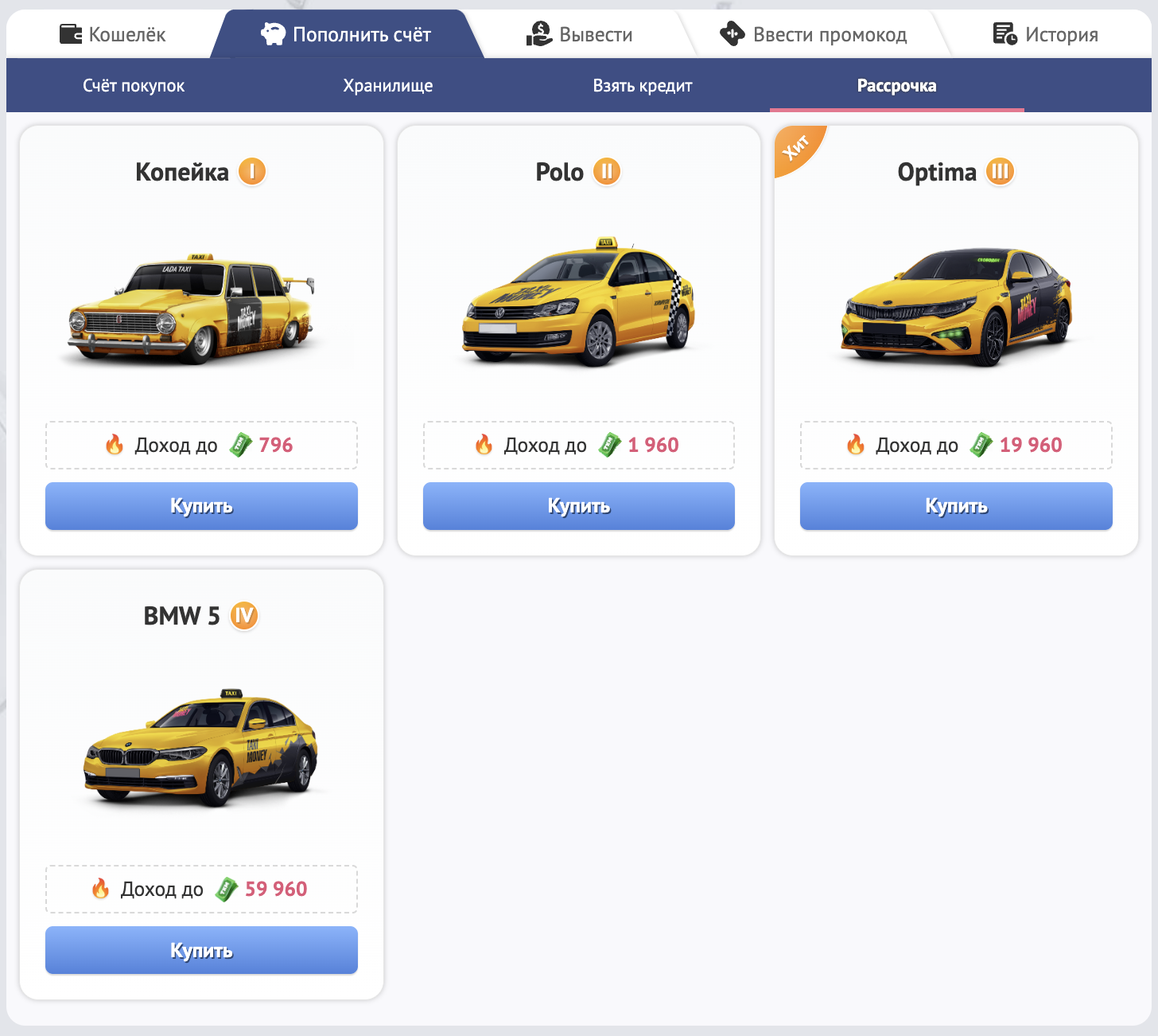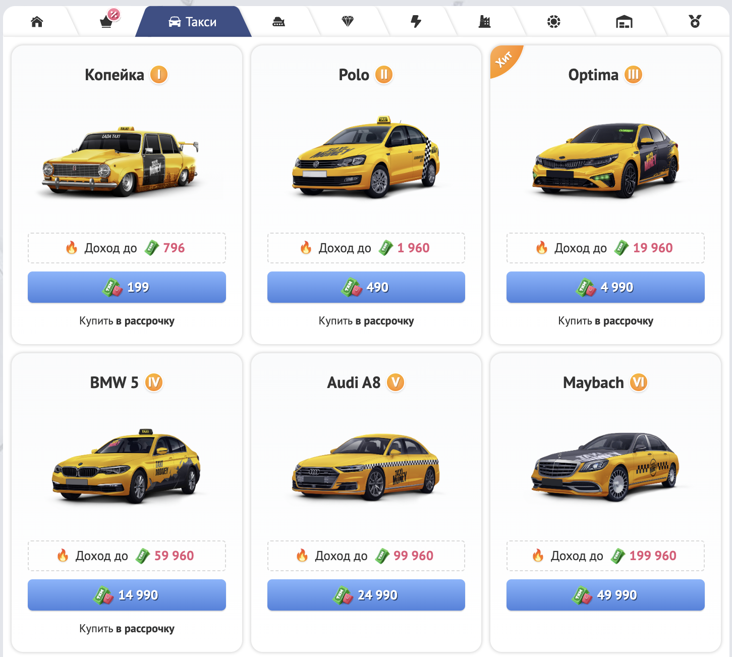 Однако (в отличие от кредита) в рассрочку нельзя приобрести здания в Taxi-Polis, виртуальные бизнесы и т.д.