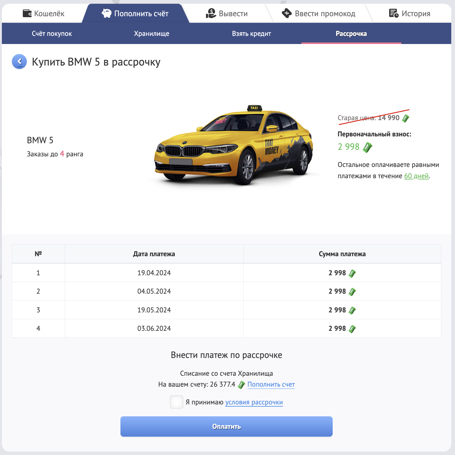 После того, как Вы совершите первый платёж, рассрочка будет автоматически оформлена, а выбранное такси появится у Вас в Гараже.