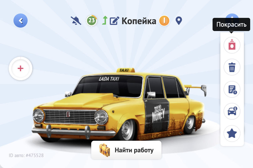 Для изменения цвета необходимо перейти в гараж и выбрать такси.