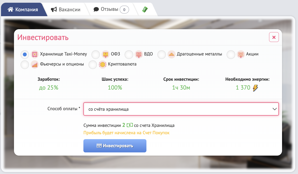Далее выберите тип инвестиции, обращая внимание на "Заработок" и "Шанс успеха". Эти параметры влияют на прибыль с инвестиции и вероятность ее получения соответственно.