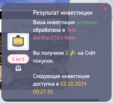 После выбора типа счета для инвестиции нажмите на кнопку "Инвестировать" и ваша инвестиция будет передана в работу сотруднику банка.В появившемся окне Вы увидите время до конца обработки инвестиции, ее размер и шанс успеха. По окончании обработки Вы получите соответствующее уведомление.
