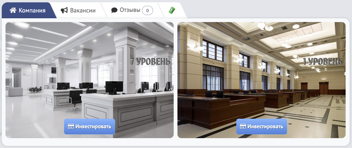 Уровень рабочего места влияет на тип инвестиции, которую Вы можете сделать в банке. Чем выше уровень рабочего места, тем более дорогие инвестиции в них возможно совершать.