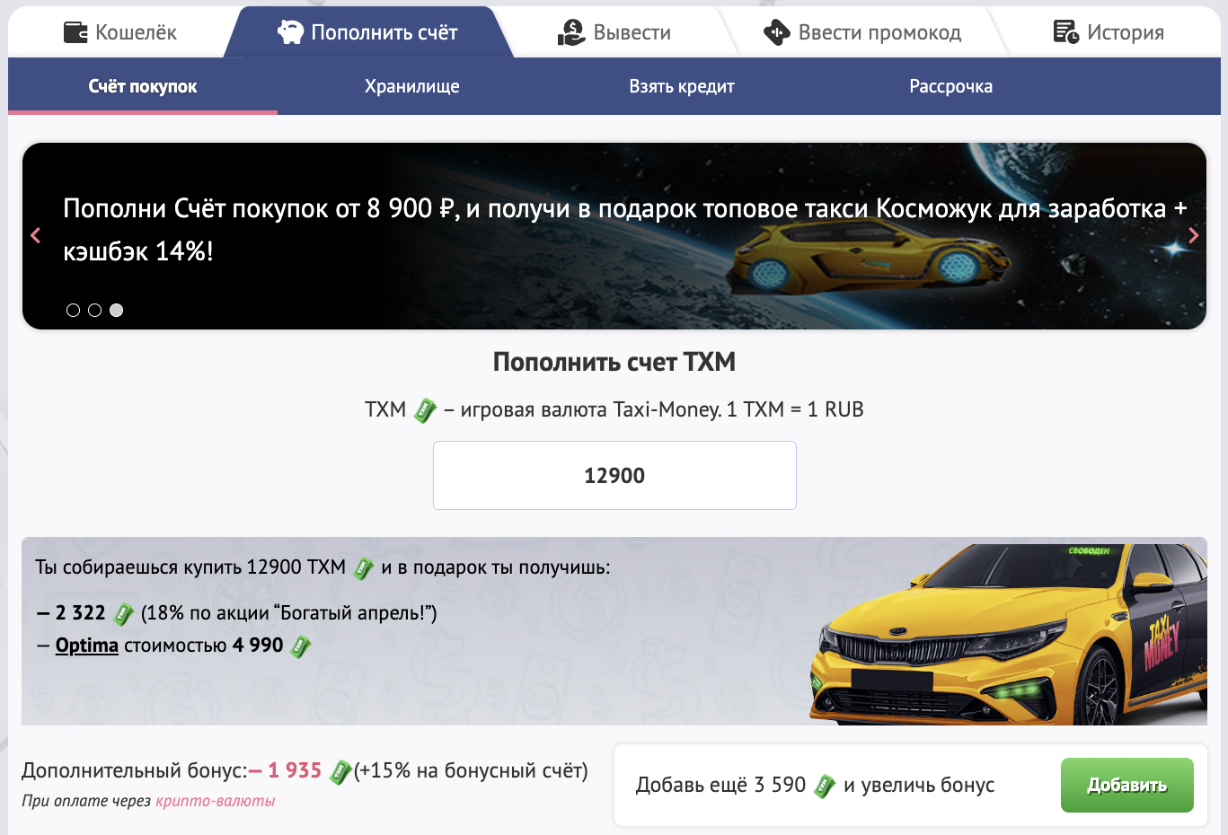 Кроме того, в Магазине доступно 6 автомобилей стоимостью от 199 ТХМ до 49 990 ТХМ. Оплатить покупку можно со Счета покупок воспользовавшись предоставленными платёжными системами или обменять средства с Пассажирского счета.