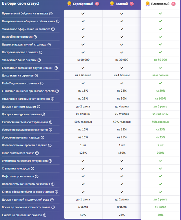 Premium-аккаунт открывает для вас новые возможности! Получите больше удовольствия от игры вместе с Premium-аккаунтом! Выбирайте статус на свой вкус!