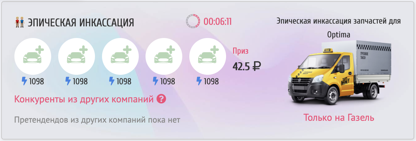 - Командный прорыв — увеличение количества зачисляемых денег в конкурсах «Самый шустрый таксист» и «Самая шустрая компания» до 10%.